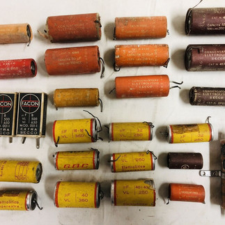 Da sinistra a destra: condensatori ceramici, dalla tipica forma a lenticchia; condensatori a film di poliestere di tipo orange drop, dal classico colore arancione; condensatori carta-olio vintage